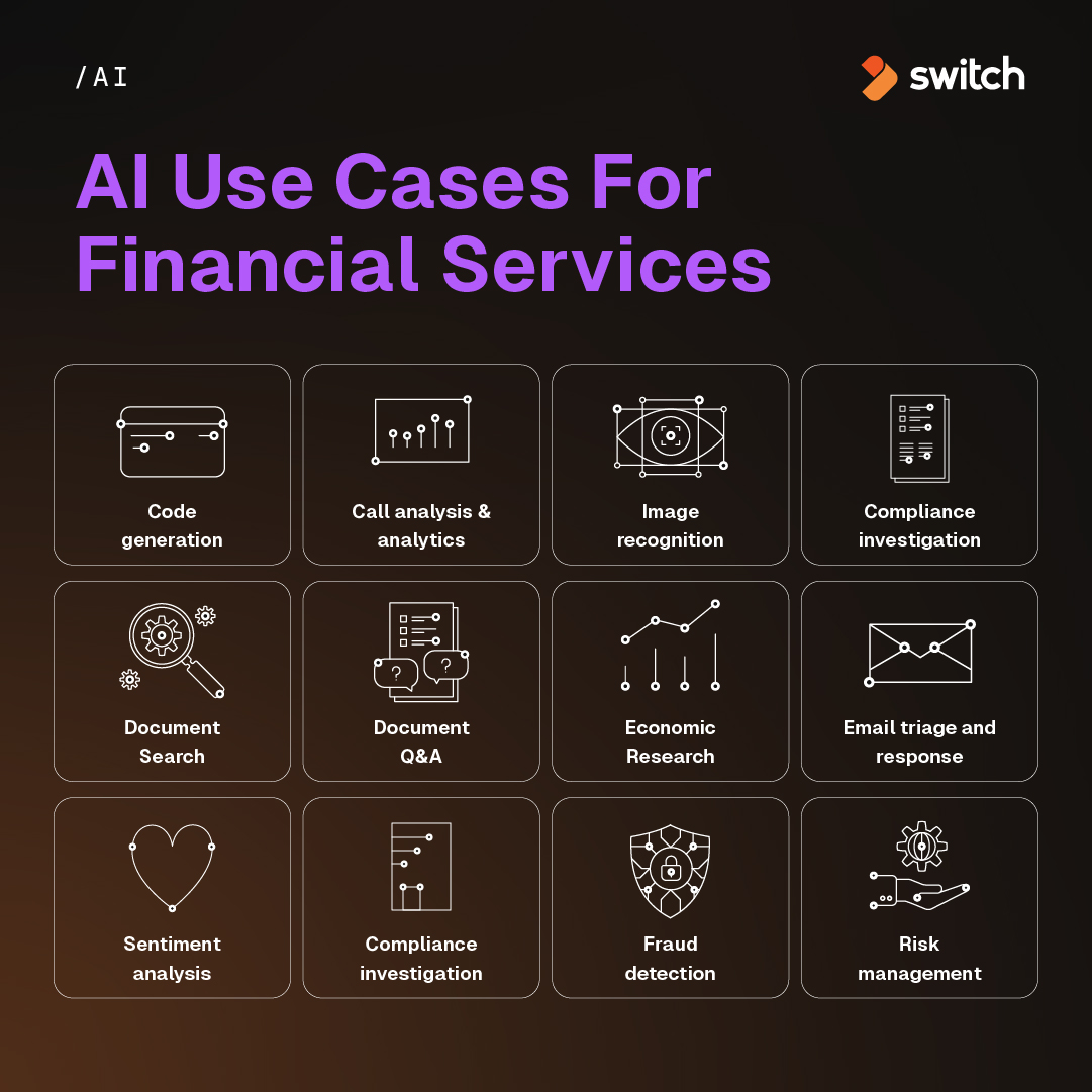 At Switch Software, we help financial organizations bridge the gap between vision and execution—designing data foundations, orchestrating GenAI workflows, and implementing data architectures that meet the industry’s highest standards of security and compliance.